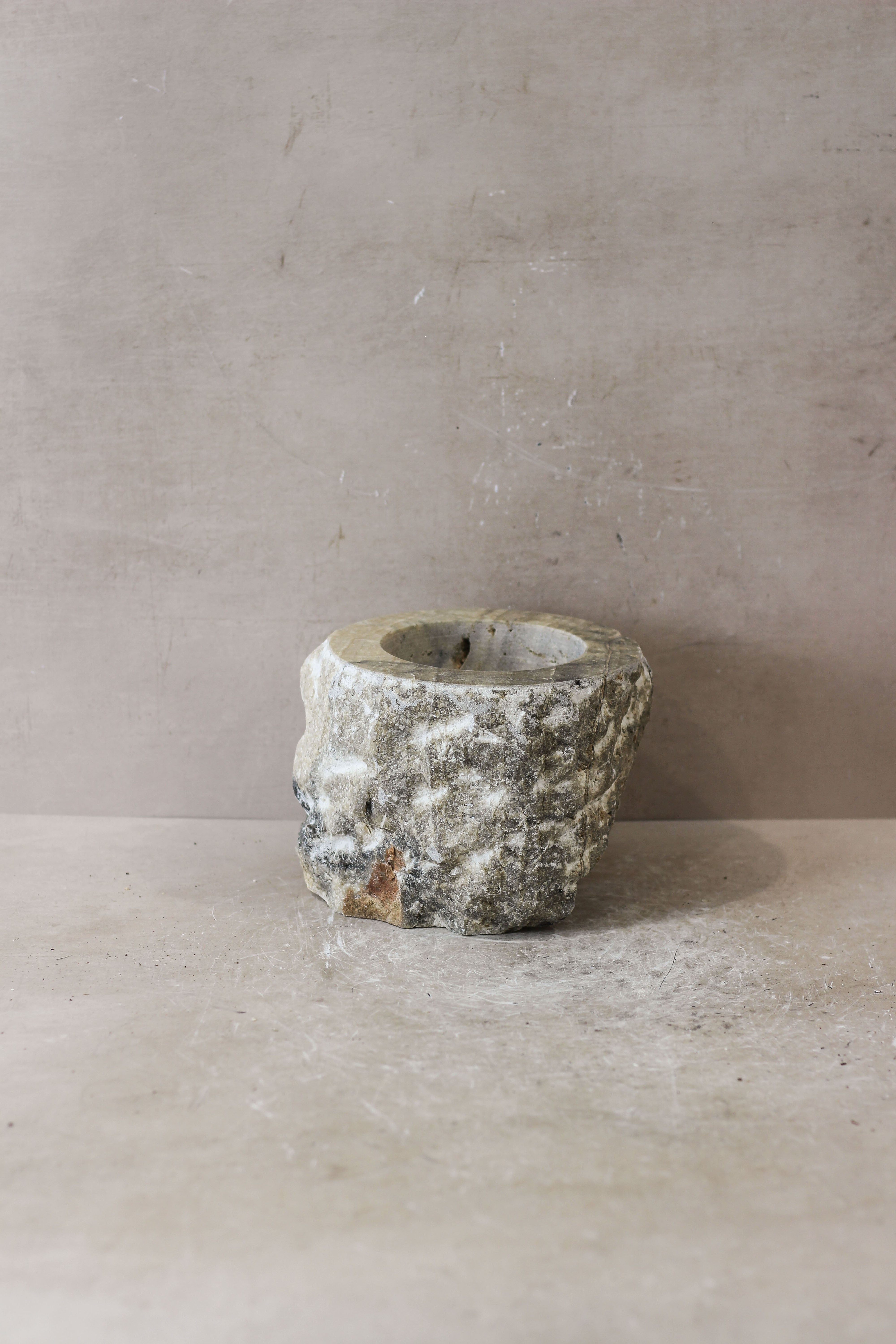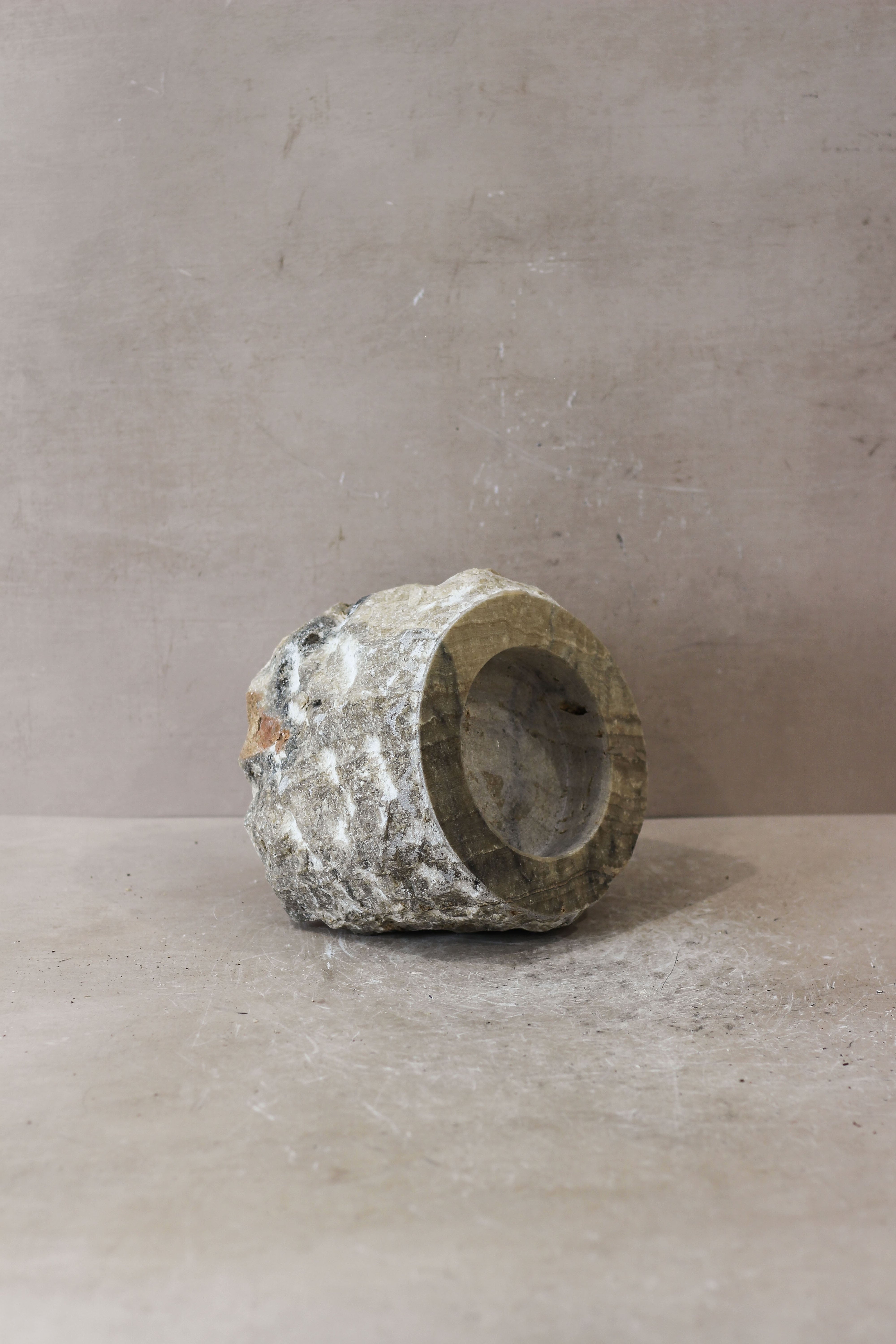 This elegant rough cut onyx candle holder is designed to hold a large candle, offering a sophisticated accent for your home. Its polished top contrasts beautifully with raw, textured sides that showcase natural pitting and cavities, embodying the organic beauty of the stone. Each candle holder is truly one-of-a-kind, with unique variations in tone, veining, and silhouette, celebrating the timeless charm and imperfections of ancient onyx.