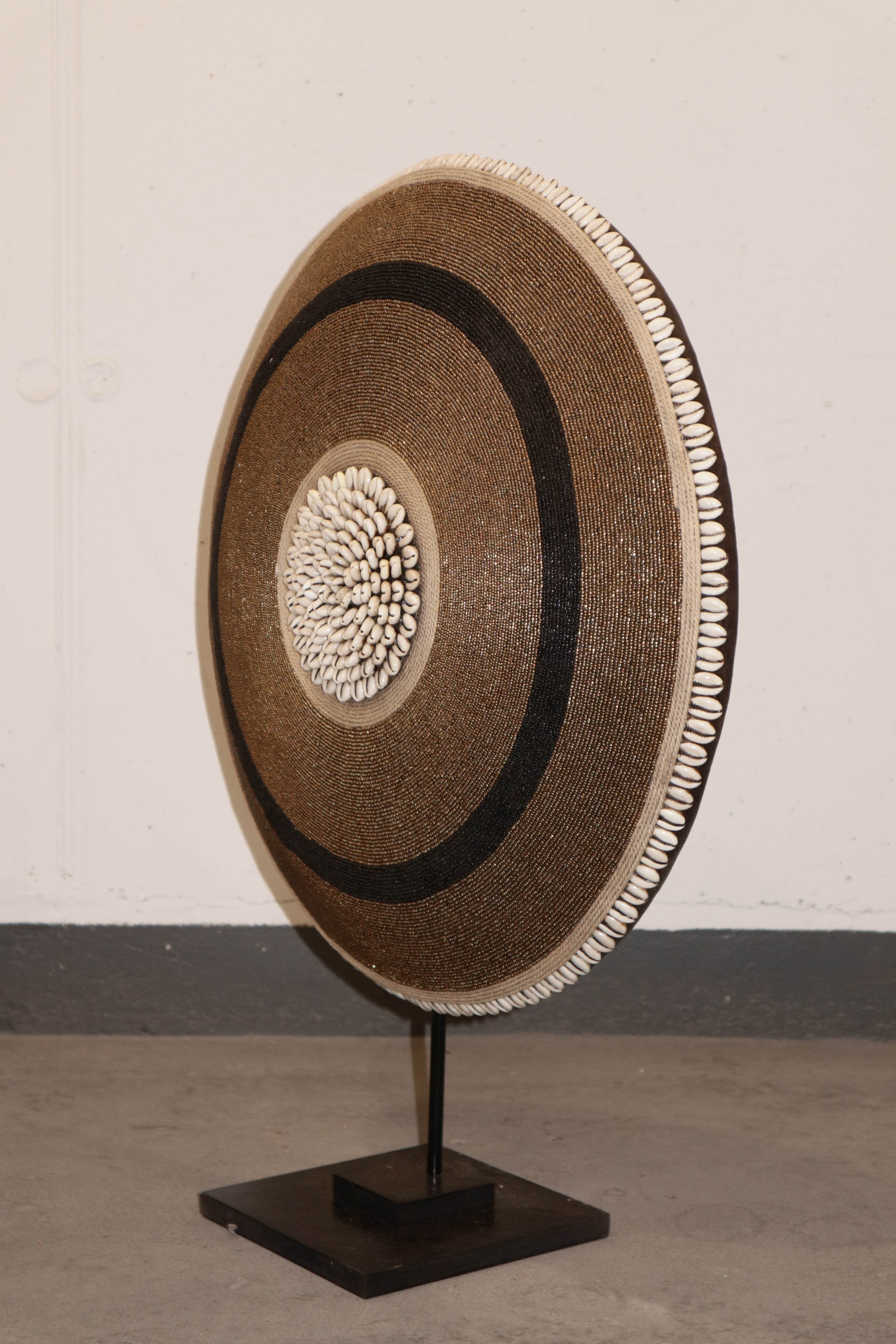 Historically used as a defensive weapon in wartime and displayed as a decorative symbol of status and wealth by the Tikar people in Cameroon. Meticulously crafted, carved from one solid piece of Baobab wood, a sacred wood used for medicinal and ritual purposes for centuries, this large shield boasts hundreds of hand-placed beads on manila string in a circular pattern around a dimensional cluster of natural cowrie shells in the centre. These decorative shields are one-of-a-kind, collaboratively crafted by a large group of people to make each piece unique.