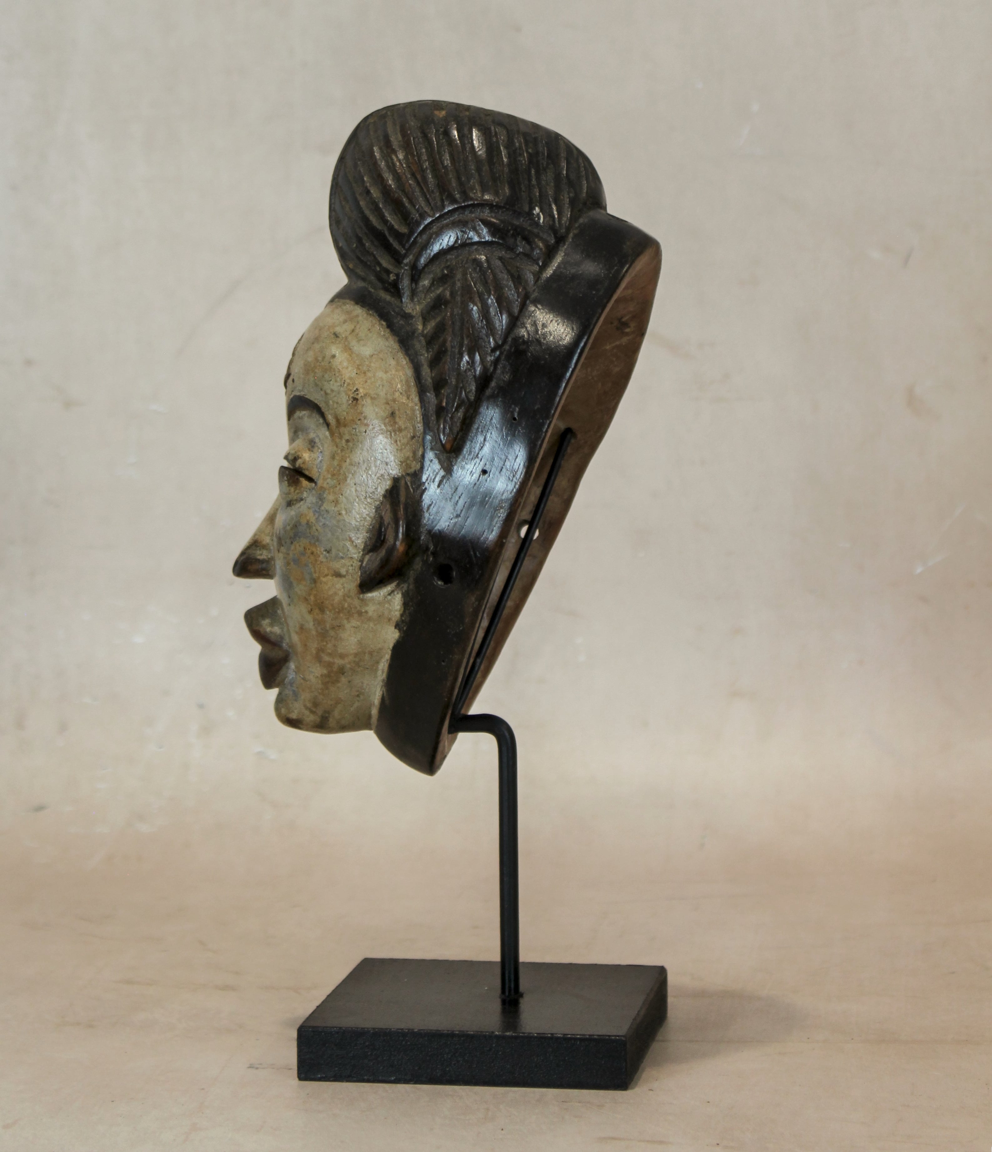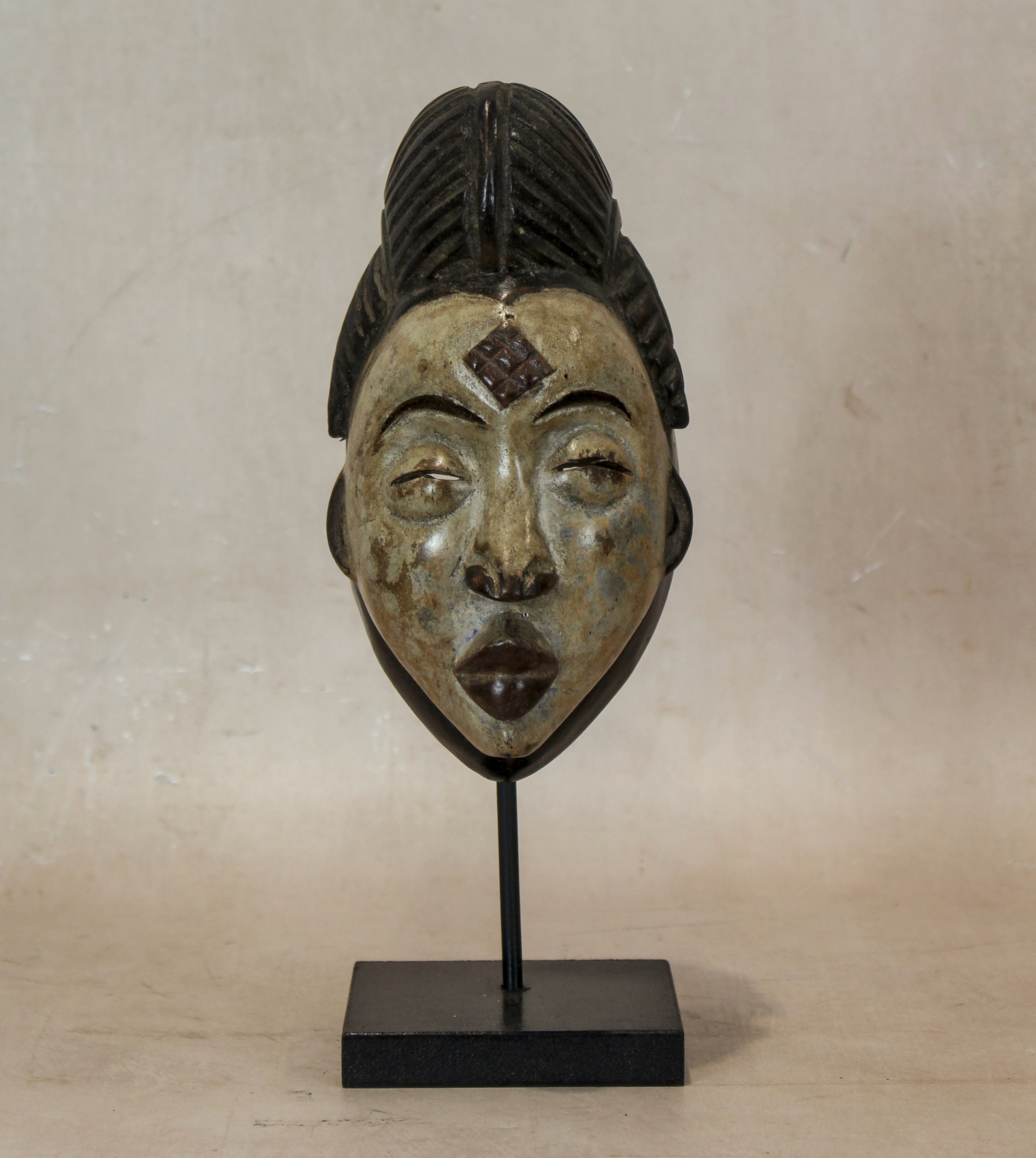 Punu masks represent the idealized beauty of Punu women and are carved meticulously by mask carvers. The masks usually represent a traditional hairstyle diamond shaped which represents wealth.