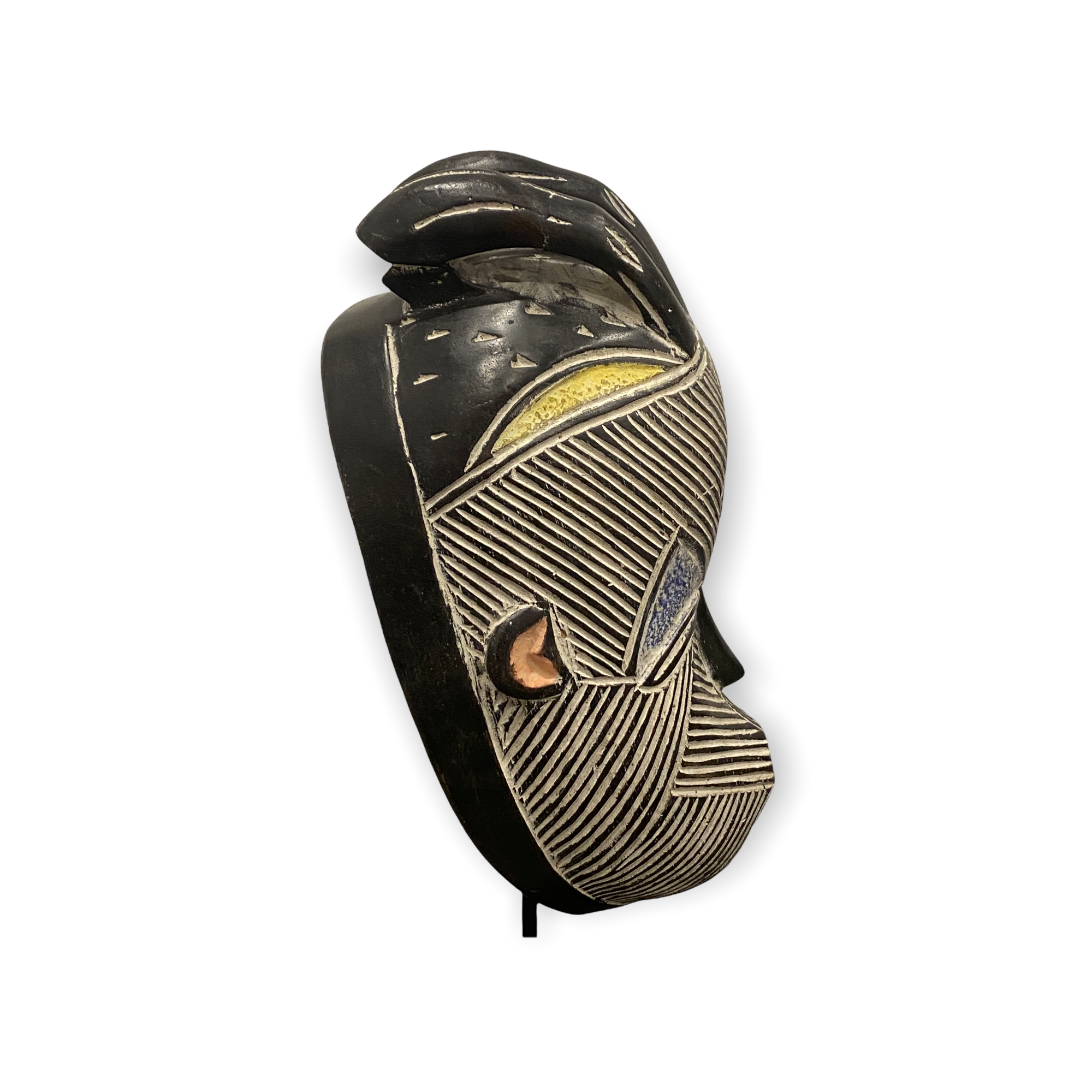 The striated masks, or kifwebe, are used as agents of a tradition and figures of authority to exercise social and political control through practices of evil magic and witchcraft by the members of the bwadi bwa kifwebe society. Among the societies’ public performances, three mask types exist: two grades of male and one female mask. Male masks are distinguished by a striated pattern of three colours while the female one is predominantly white with the features accented in black… Significant of a Zebra.