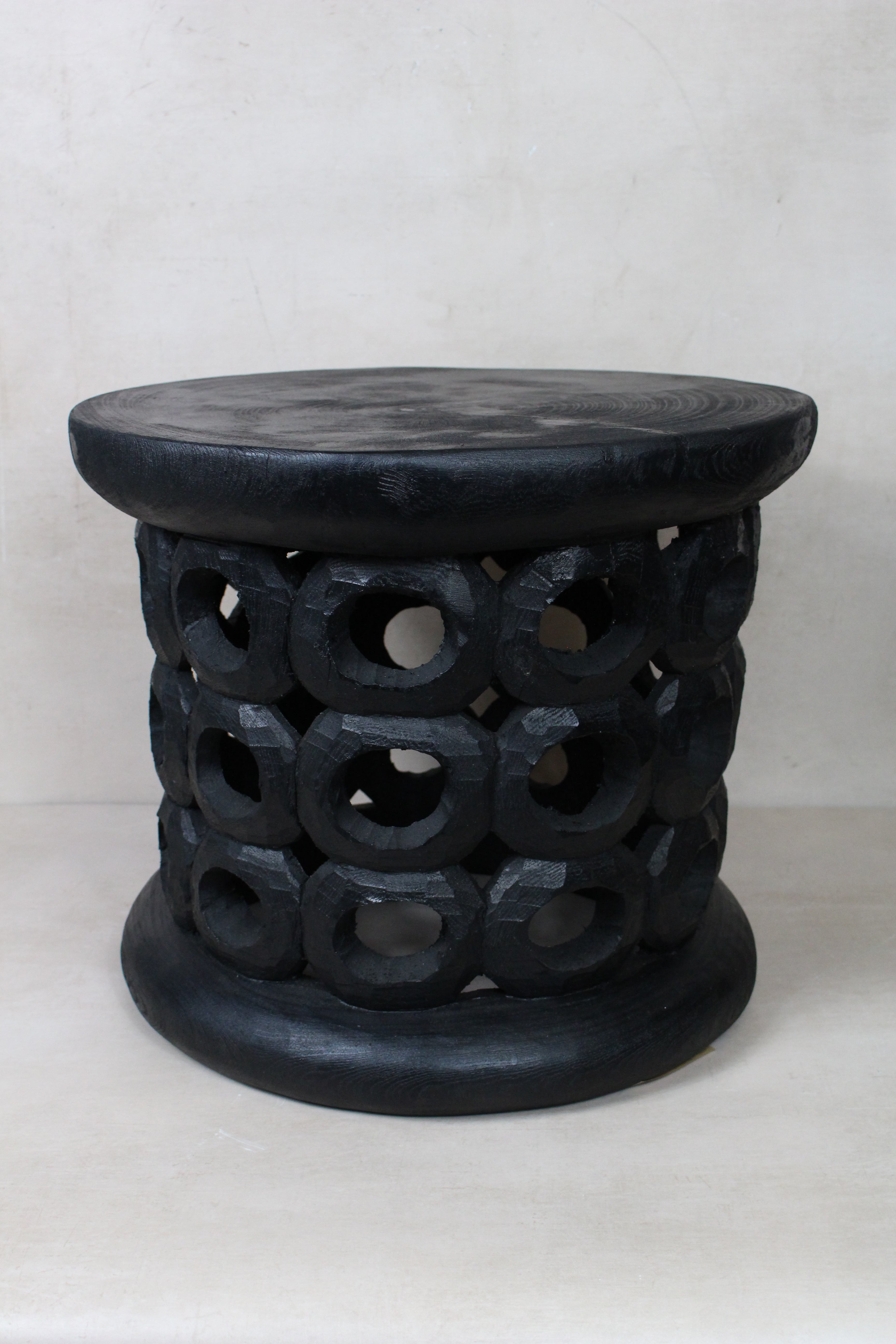 Historical Detail: The craftsmen of the Bamileke are famed for their skill in woodcarving. They create a variety of remarkable round stools with repetitive openwork designs, all carved out of one tree trunk stump.