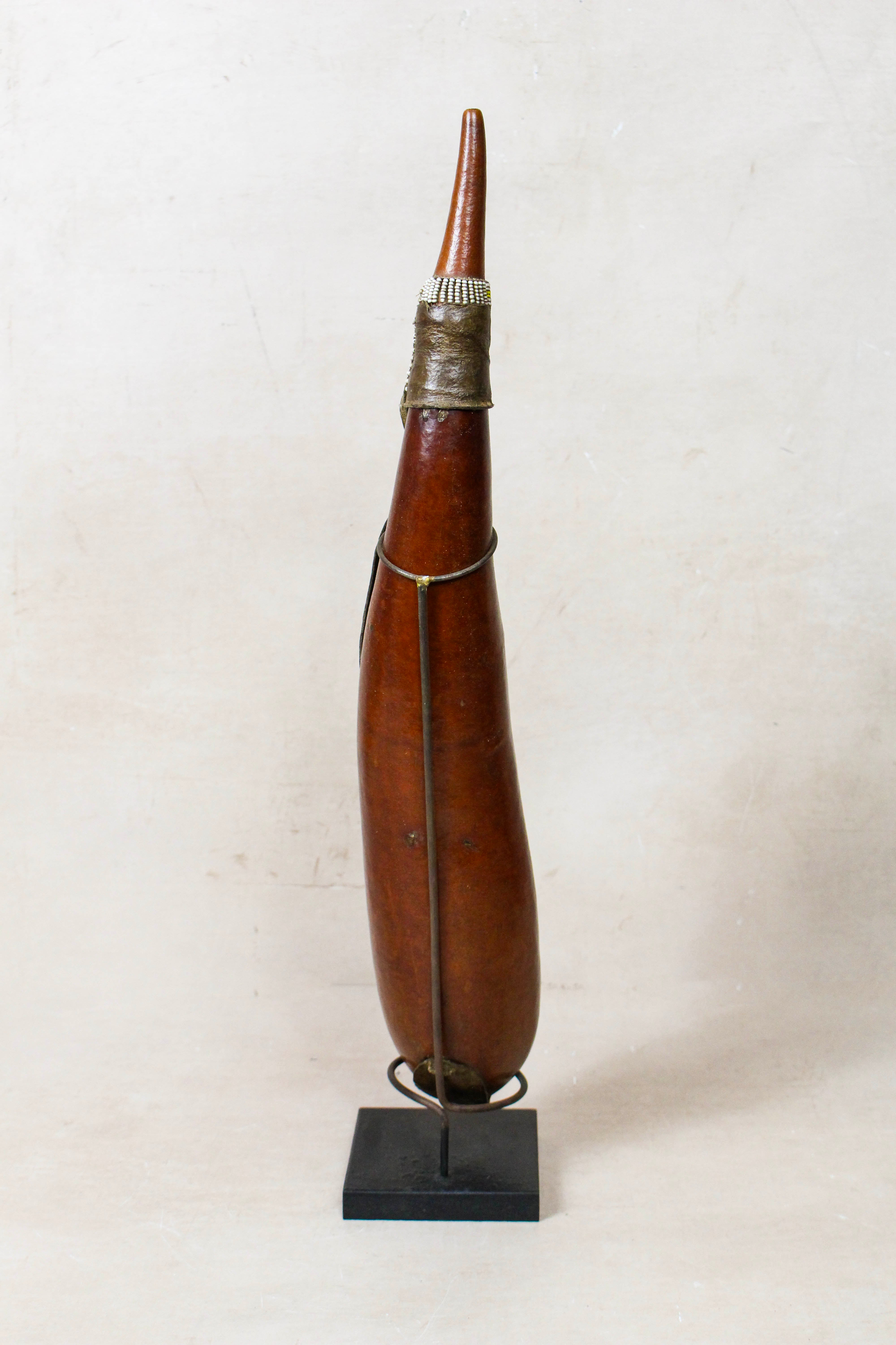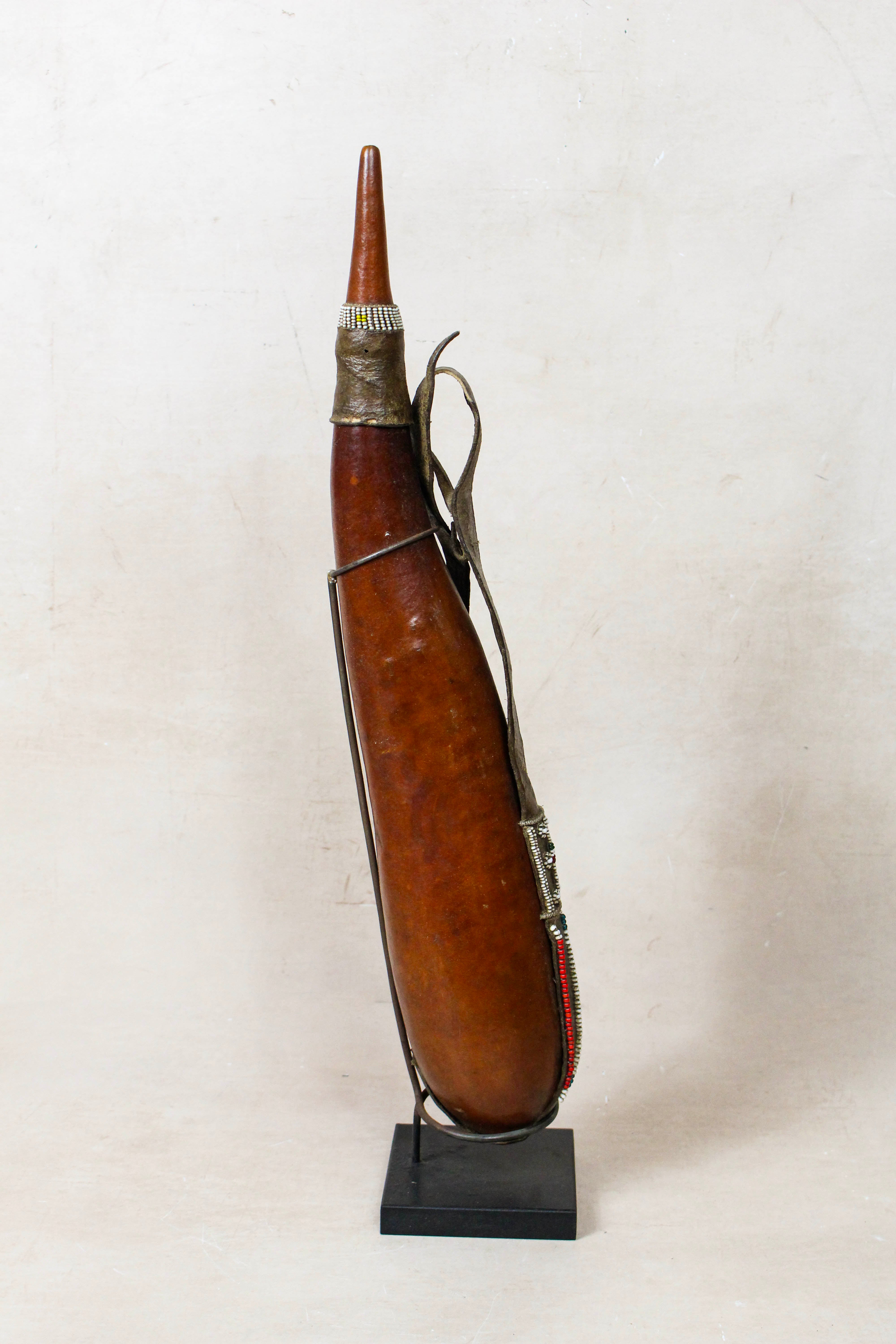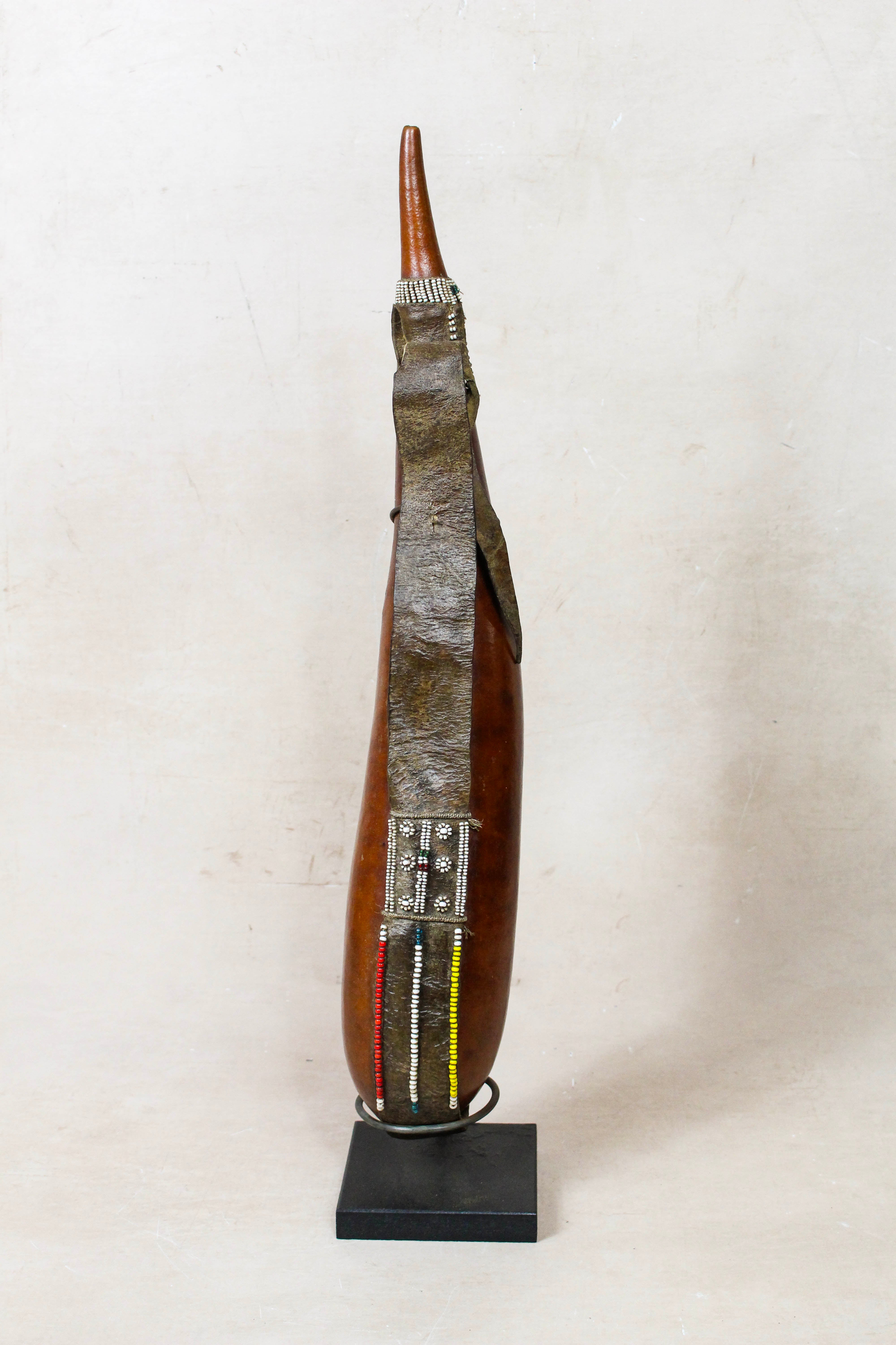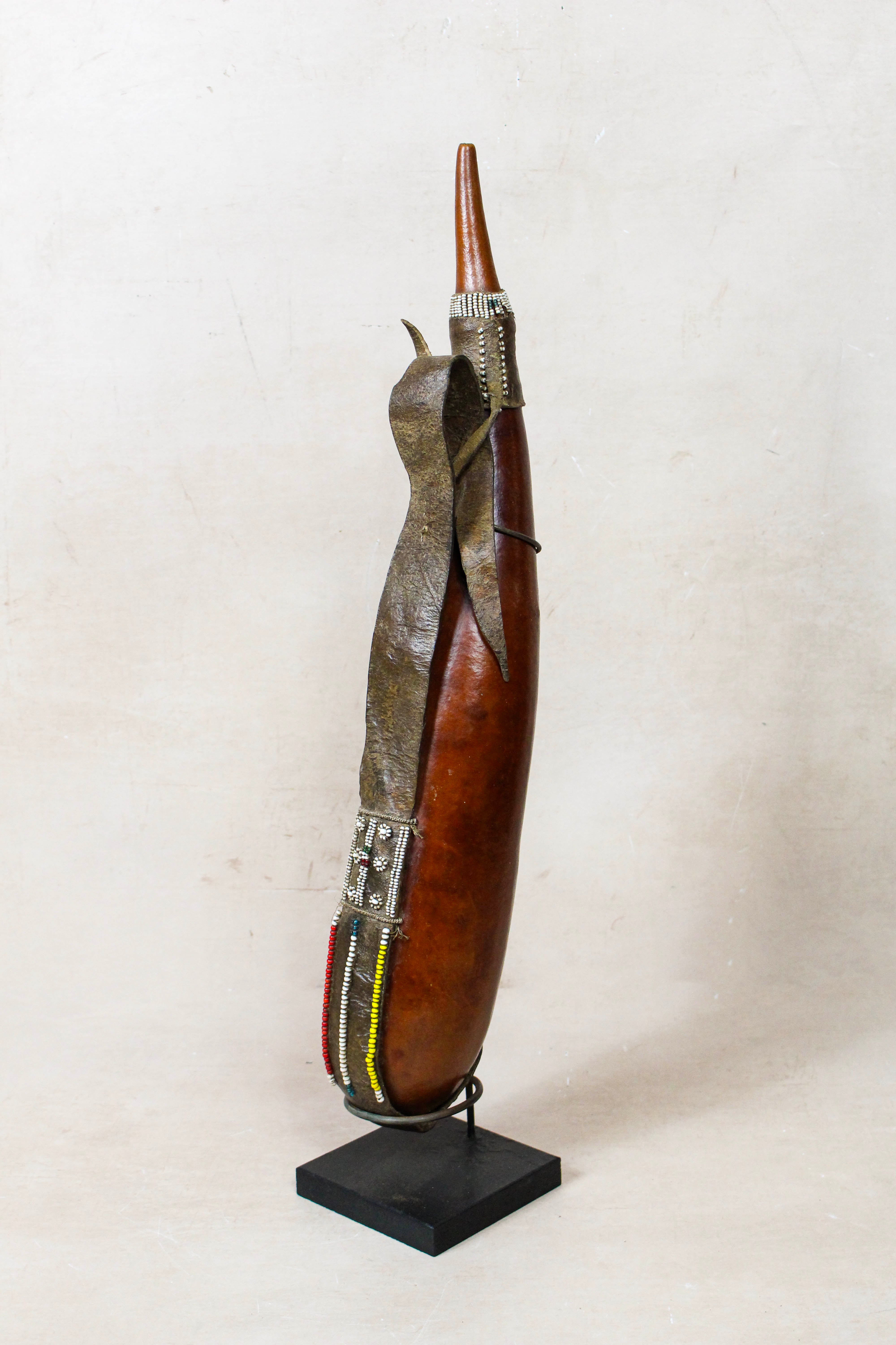 This authentic, hand-crafted calabash is more than just a vessel; it is a storied piece of East African heritage. Traditionally used by the Maasai people of Kenya and Tanzania for storing and cooling milk or water, these gourds are prized for their organic silhouettes and the personal history etched into their decorative repair work.