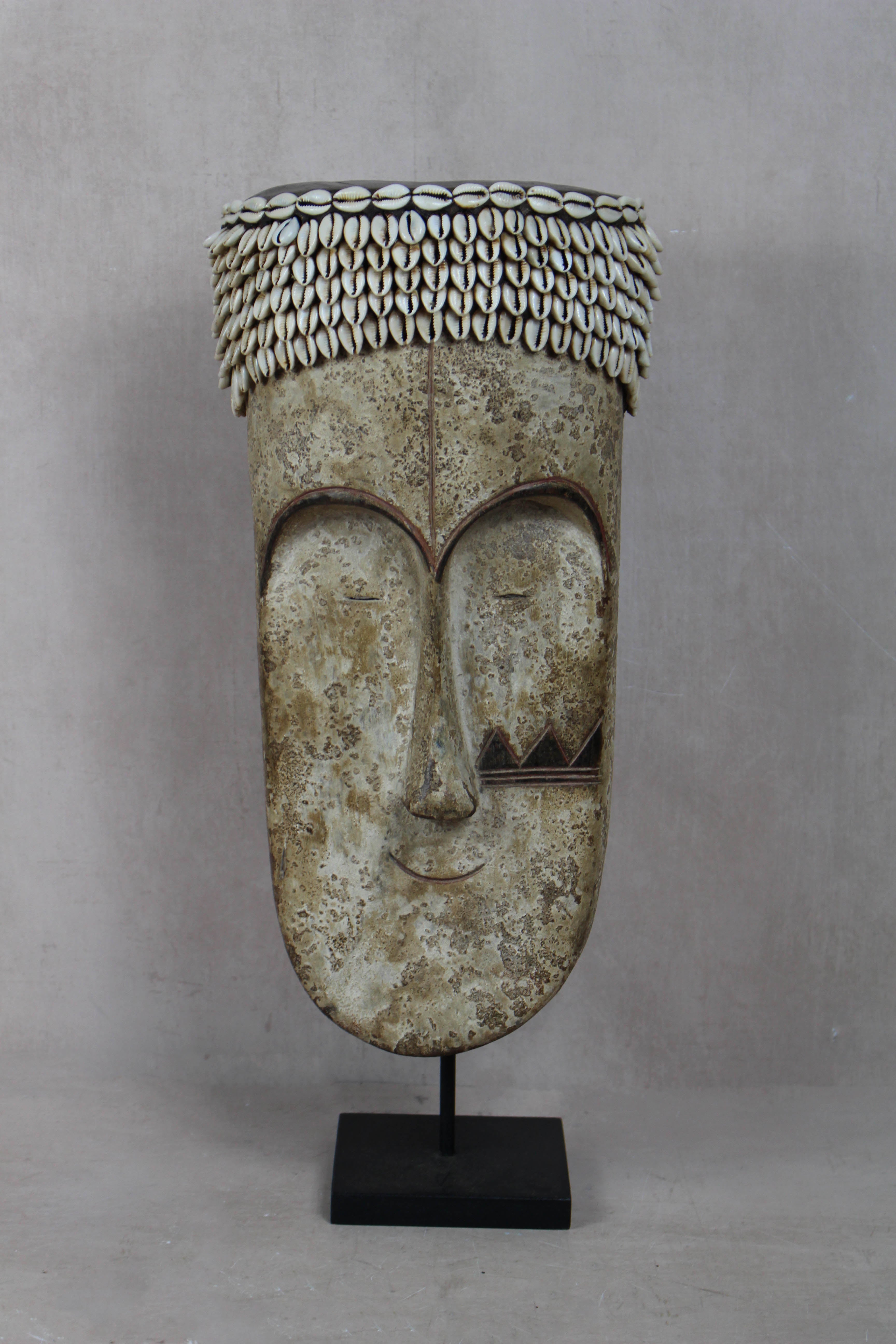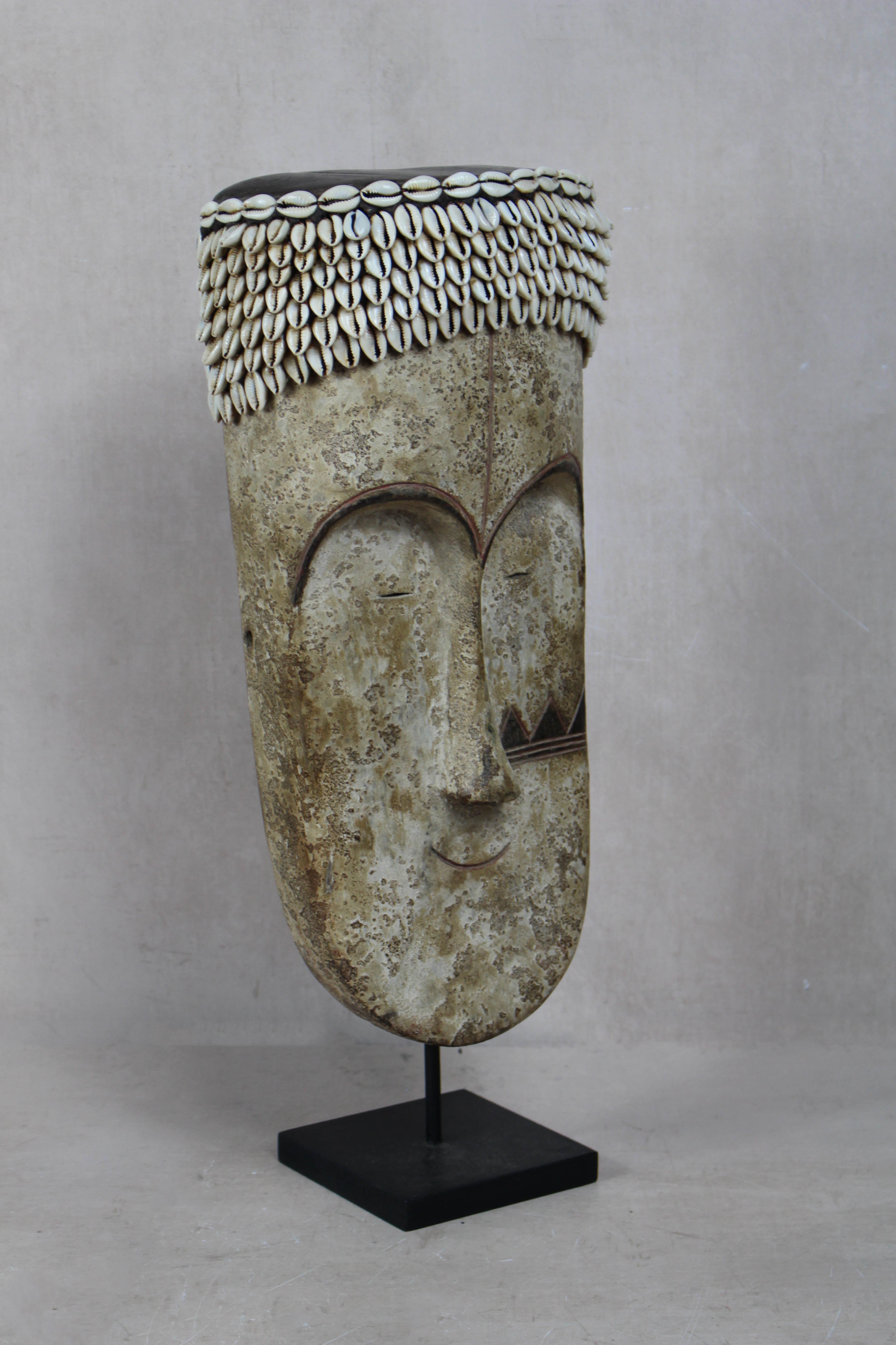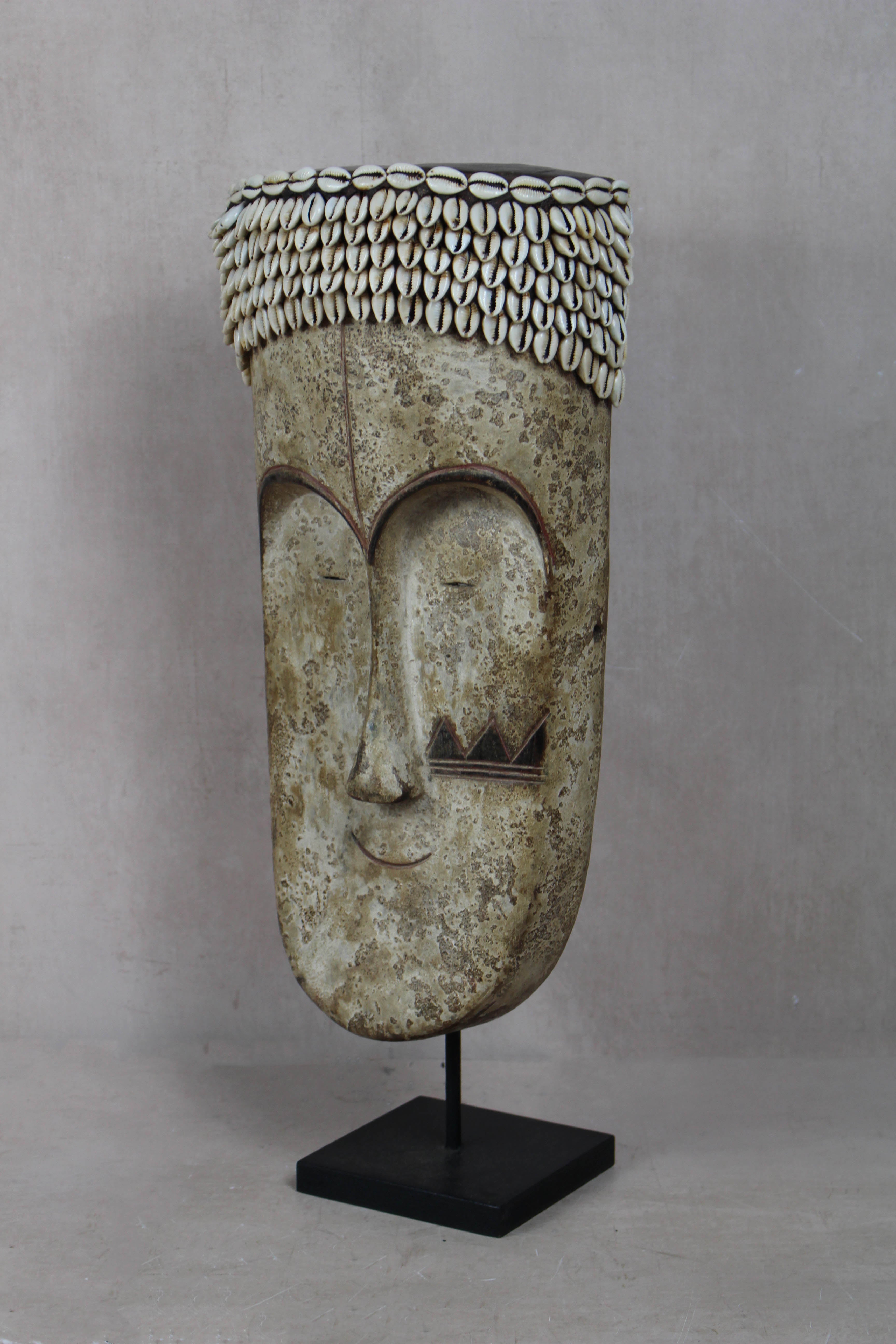 Well known for their reliquary figures the Fang also danced finely sculpted masks during a number of ritual activities. Among the Fang, white-painted masks identified with the Ngil society are known for their elegant abstractions of the human face. Ngil masks have been described as having a 'heart-shaped face' due to the facial features emphasizing refined curves of the orbital ridges above the eyes and the prominent line of the long tapering nose that ended above a discretely mouth  carved at the bottom of the chin that completes the abstraction of the face. The Fang people used masks in their secret societies. Members of this male society wore the Ngil masks during the initiation of new members and the persecution of wrongdoers. Masqueraders, clad in raffia costumes and attended by helpers, would materialize in the village after dark, illuminated by flickering torchlight.