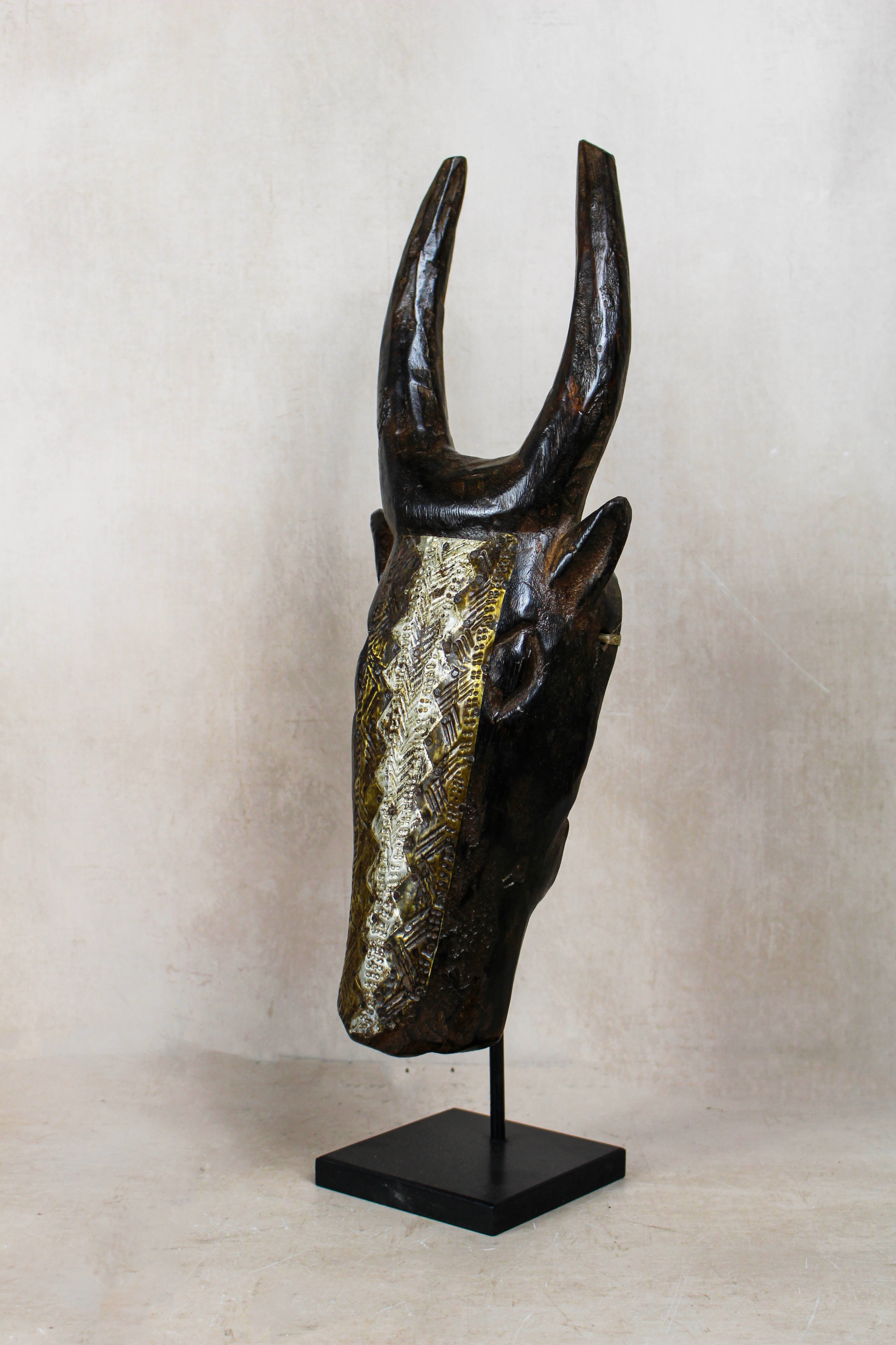• Strong, Sculptural Form: Carved from dense, dark indigenous wood, the mask features a long, powerful snout and upright horns that create a commanding silhouette.