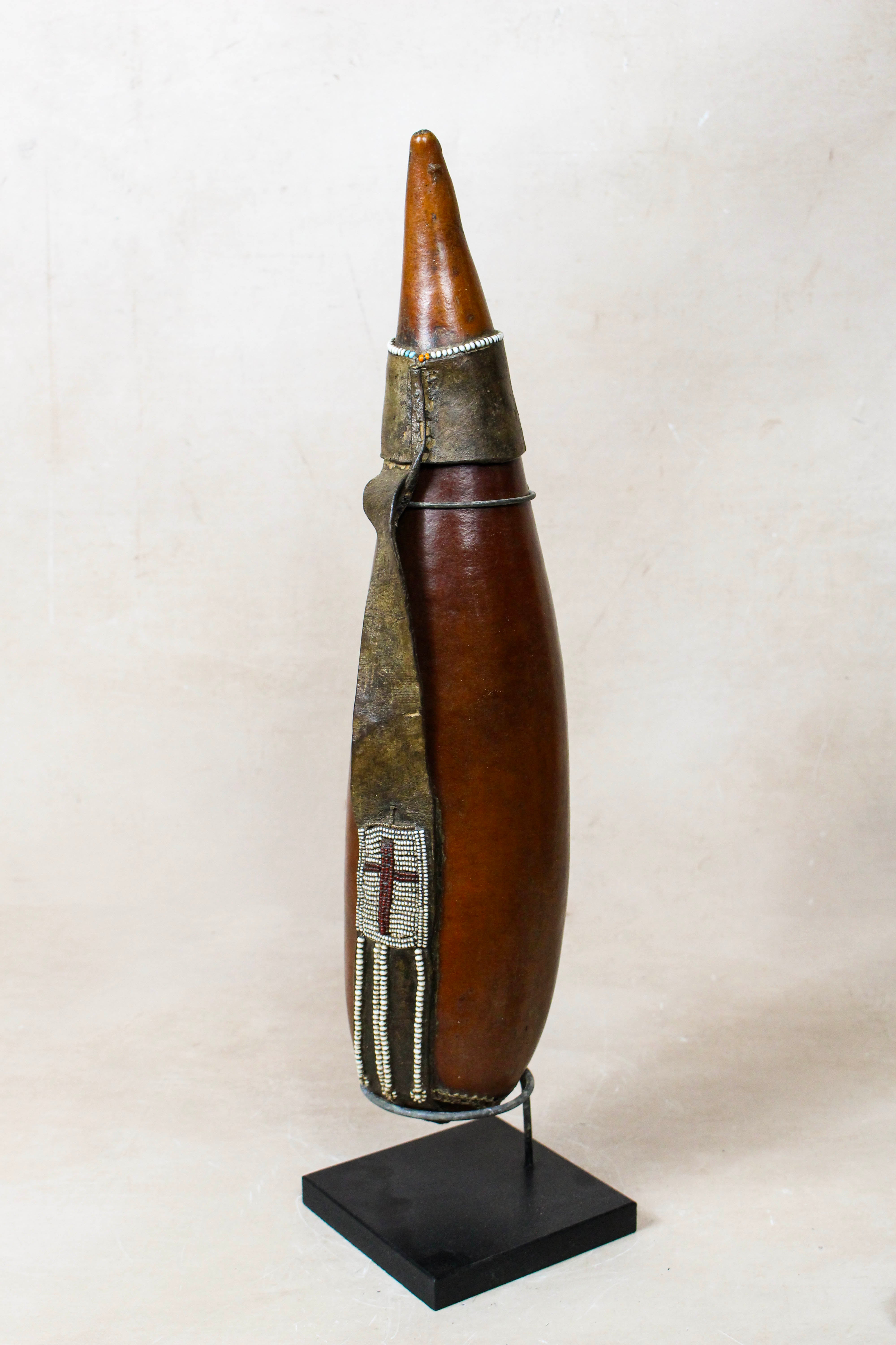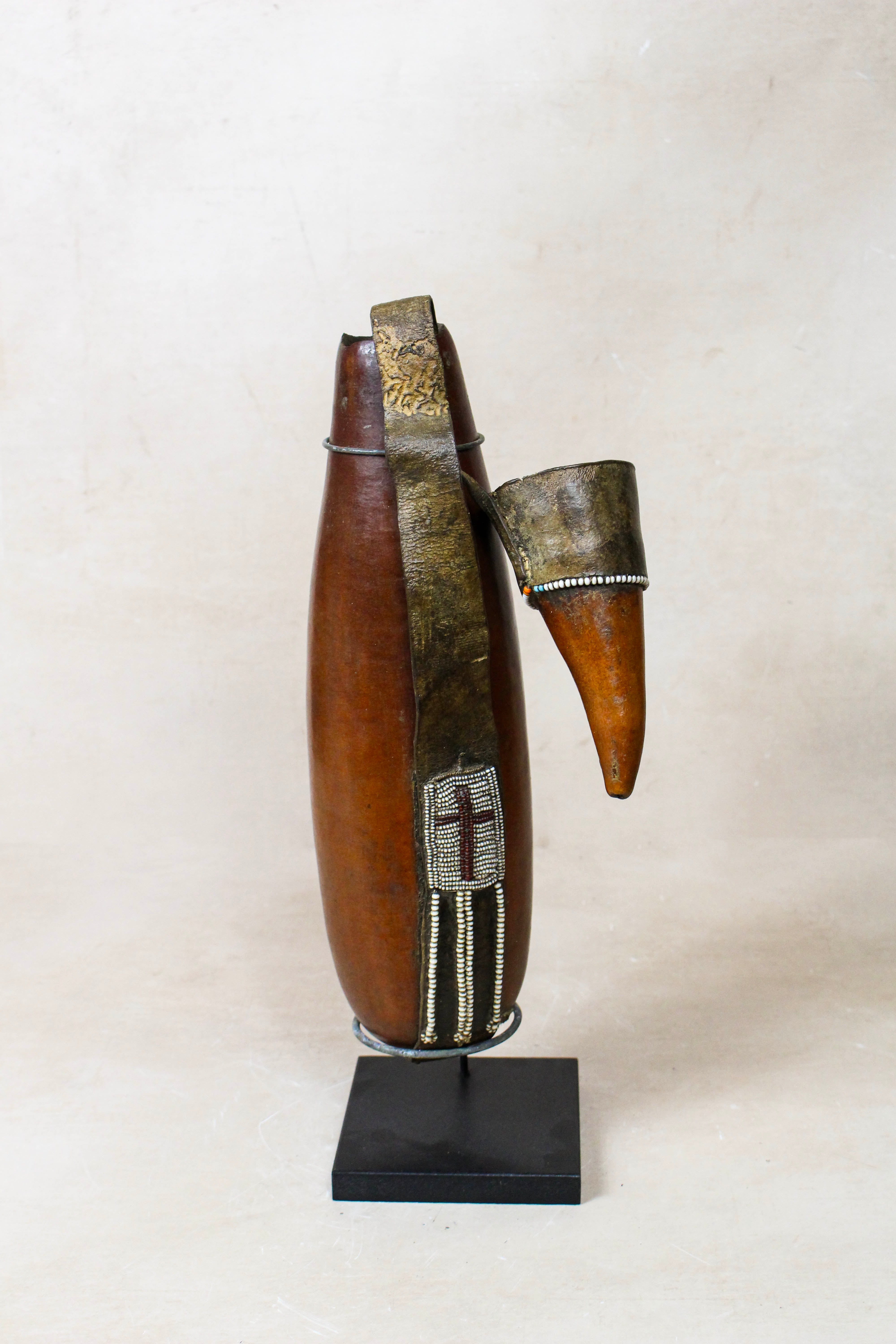This authentic, hand-crafted calabash is more than just a vessel; it is a storied piece of East African heritage. Traditionally used by the Maasai people of Kenya and Tanzania for storing and cooling milk or water, these gourds are prized for their organic silhouettes and the personal history etched into their decorative repair work.