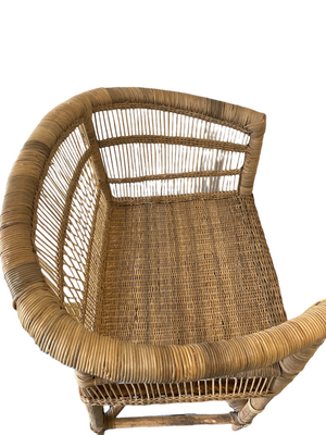 Malawi chairs are handmade using rattan strips, which are woven into intricate patterns along the sides of the chairs and the seat. Rather than using glue or nails which is common in European design, makers secure the strips with special knots. To create a curved barrel back, they temporarily insert spare parts from cars and bicycles that guide them as they work.