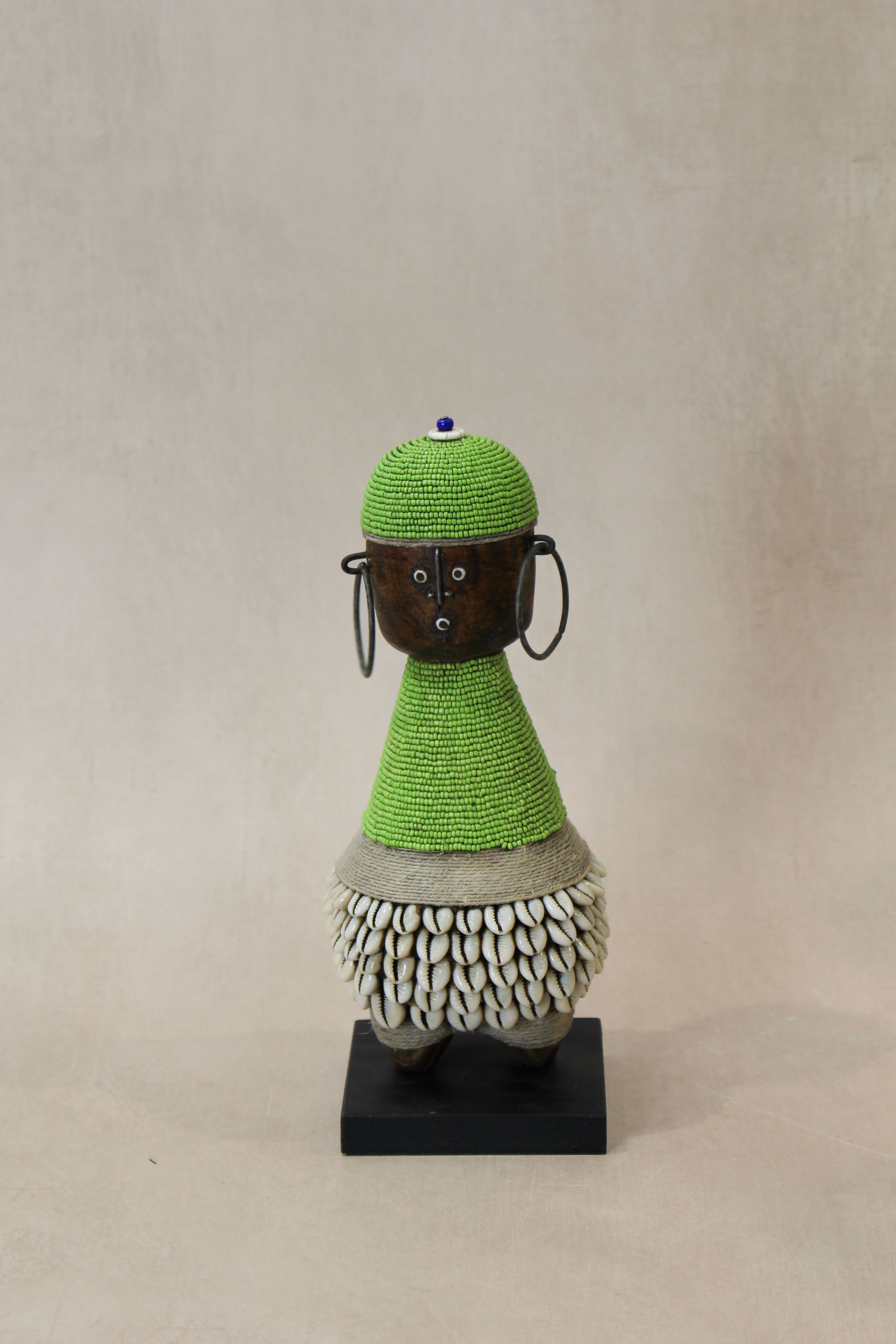 Namchi/Namji dolls are carved from African Rosewood, a legume tree native to the Democratic Republic of Congo, Cameroon, Gabon and Equatorial Guinea. A single block of African Rosewood wood is hand carved into a geometric shape and decorated with multi coloured beads, metals, fibre, cowrie shells, coins, and even leather. Each doll is carved with a unique stature and facial expression. Unadorned dolls made by blacksmiths are played with by young children.