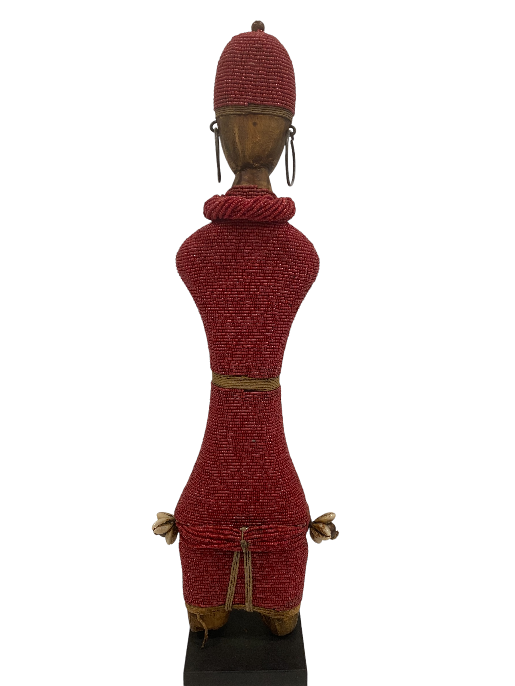 Namchi/Namji dolls are carved from African Rosewood, a legume tree native to the Democratic Republic of Congo, Cameroon, Gabon and Equatorial Guinea. A single block of African Rosewood wood is hand carved into a geometric shape and decorated with multi coloured beads, metals, fibre, cowrie shells, coins, and even leather. Each doll is carved with a unique stature and facial expression. Unadorned dolls made by blacksmiths are played with by young children.