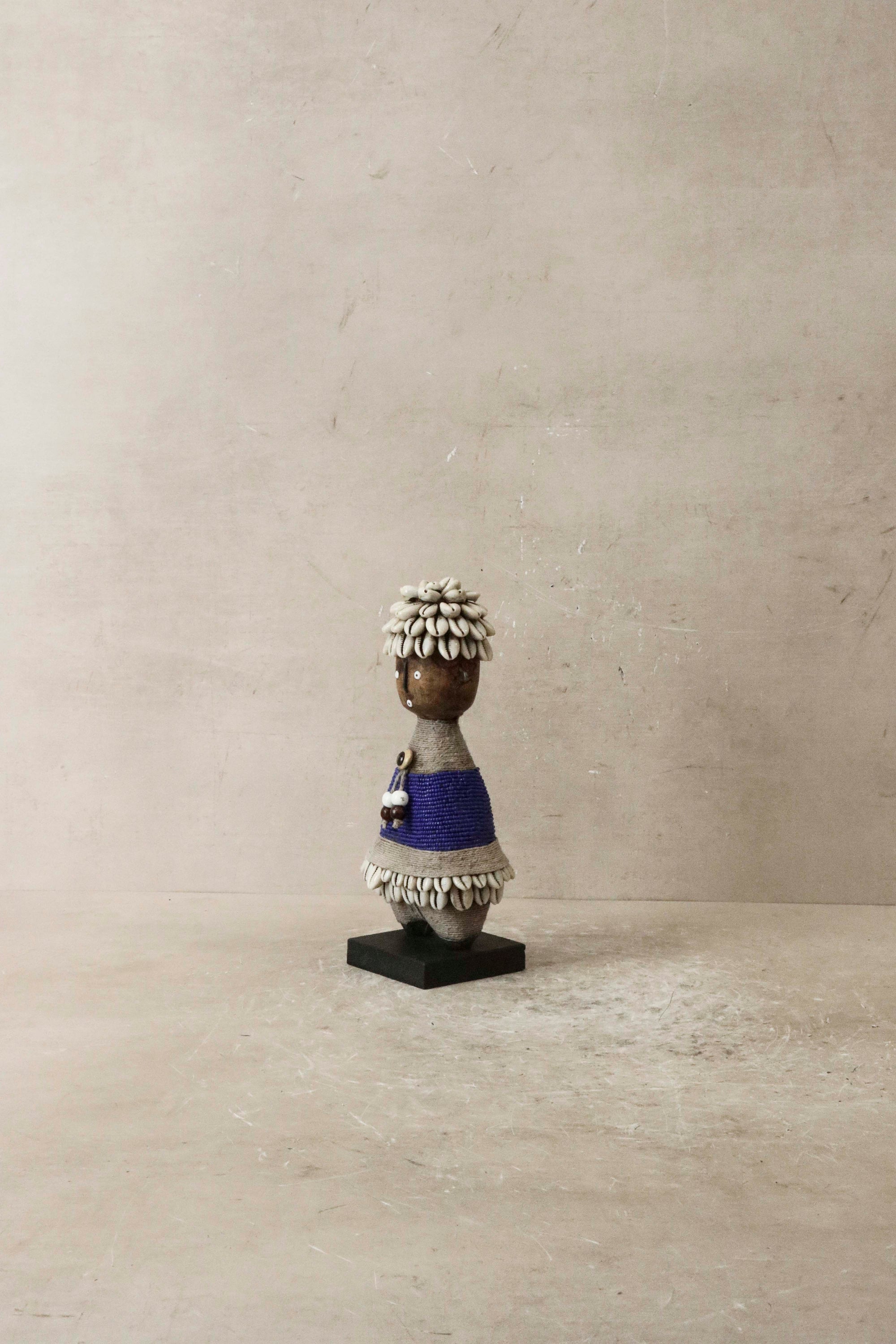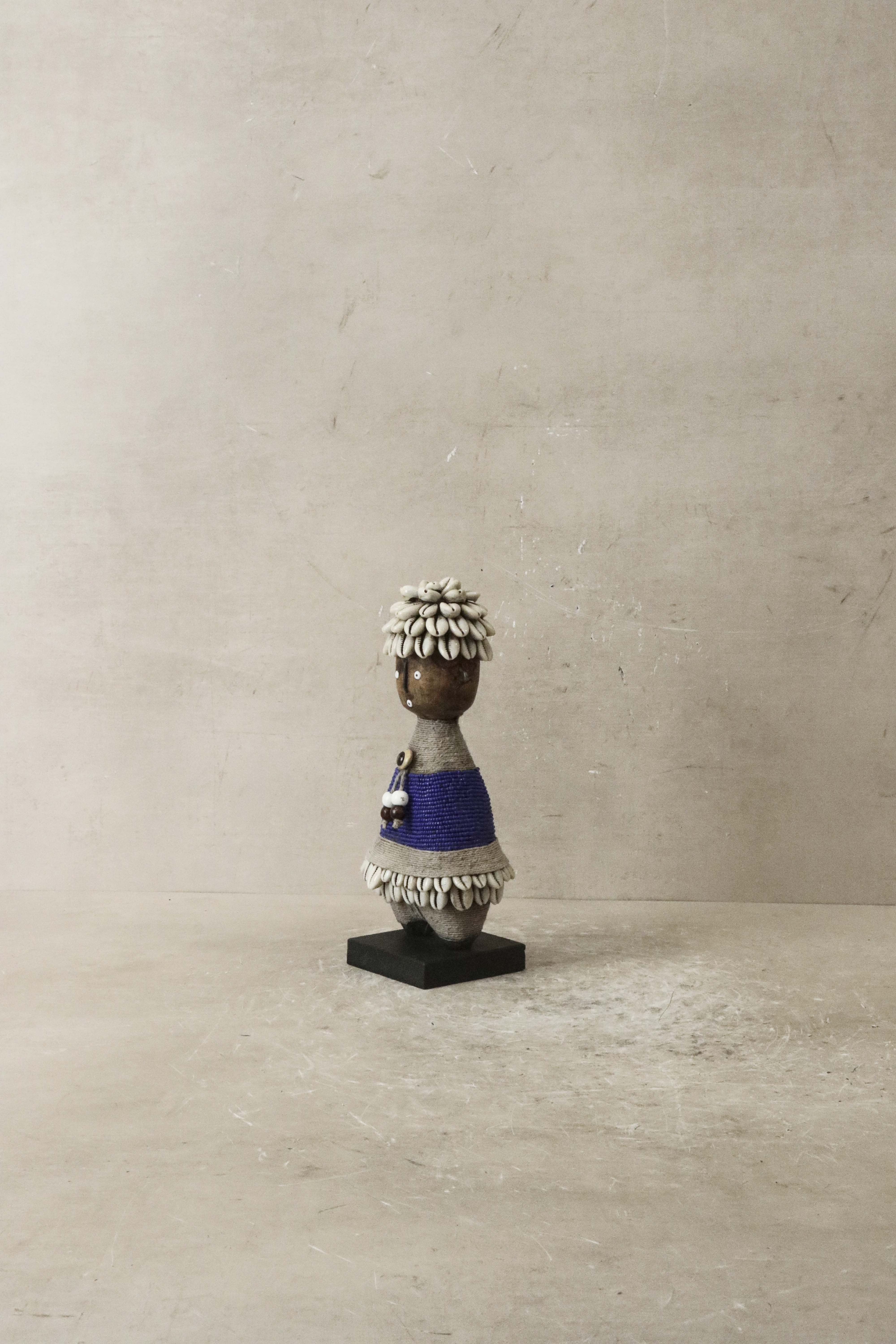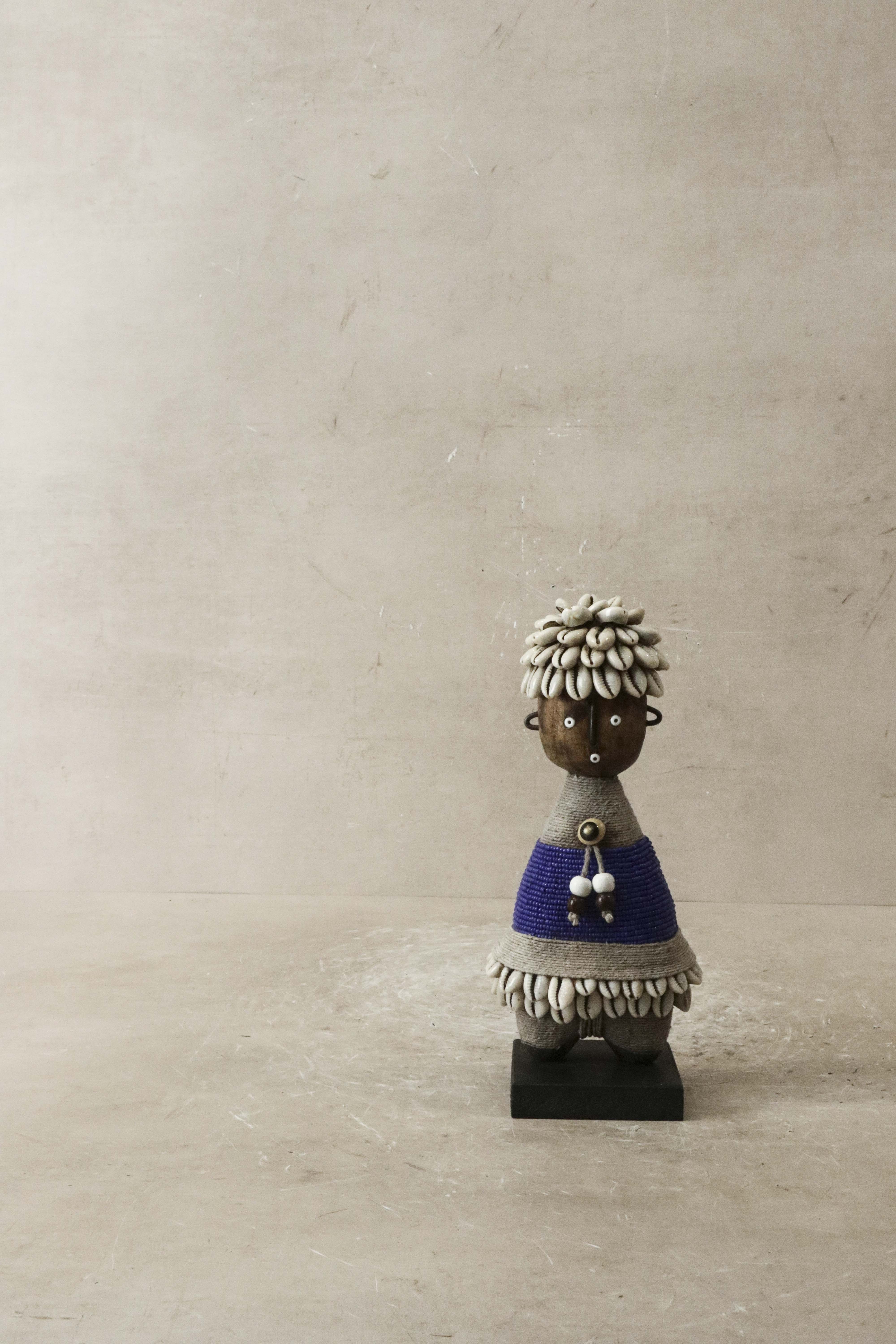 Intricate Adornments: The doll is adorned with multi-colored beads, metals, fibers, cowrie shells, coins, and leather, each element thoughtfully placed to enhance its aesthetic appeal. These embellishments not only add to its beauty but also reflect traditional practices.