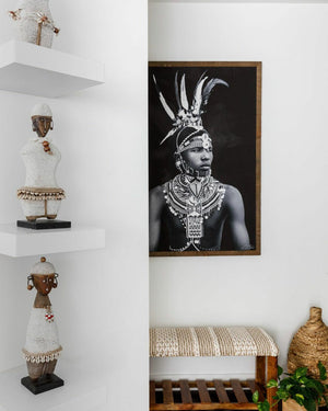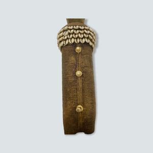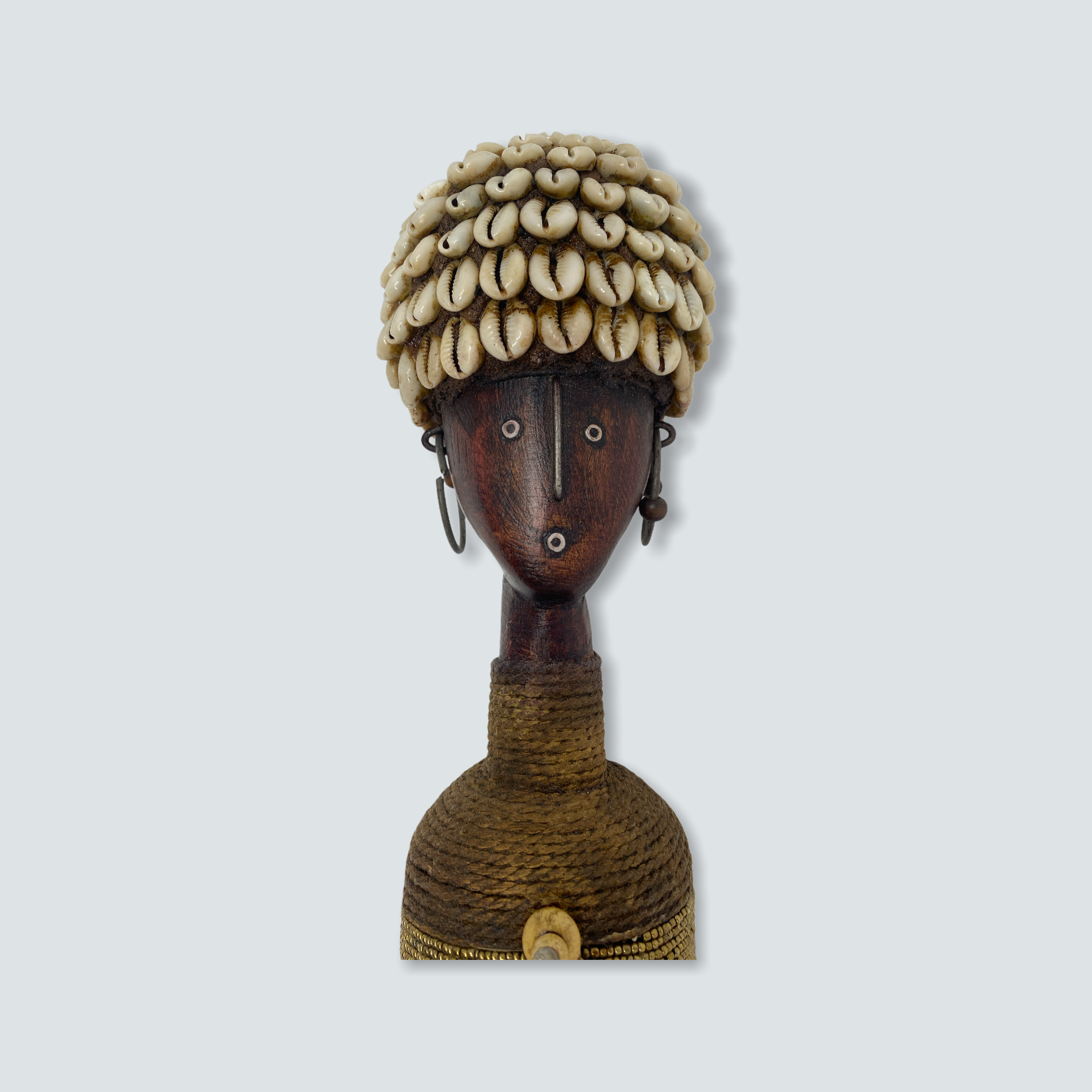 Namchi/Namji dolls are carved from African Rosewood, a legume tree native to the Democratic Republic of Congo, Cameroon, Gabon and Equatorial Guinea. A single block of African Rosewood wood is hand carved into a geometric shape and decorated with multi coloured beads, metals, fibre, cowrie shells, coins, and even leather. Each doll is carved with a unique stature and facial expression. Unadorned dolls made by blacksmiths are played with by young children.