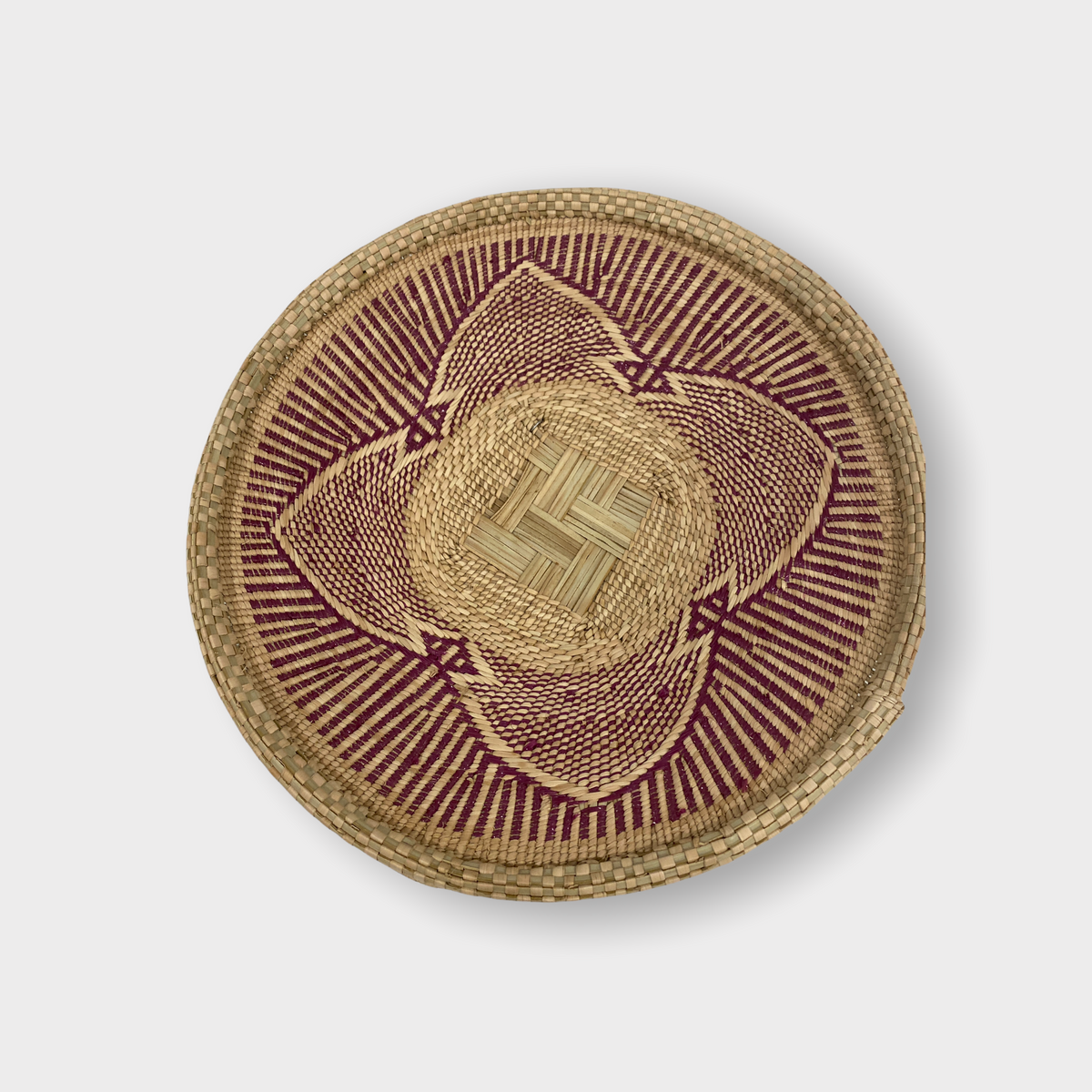 These solid-edged baskets are the apex of the basket maker’s art in Zimbabwe. The baskets start as a woven square and end up almost perfectly round. The design is very functional, as the baskets are used to winnow grain even today. The baskets are sometimes called “grandmother baskets” because few younger women are making them.