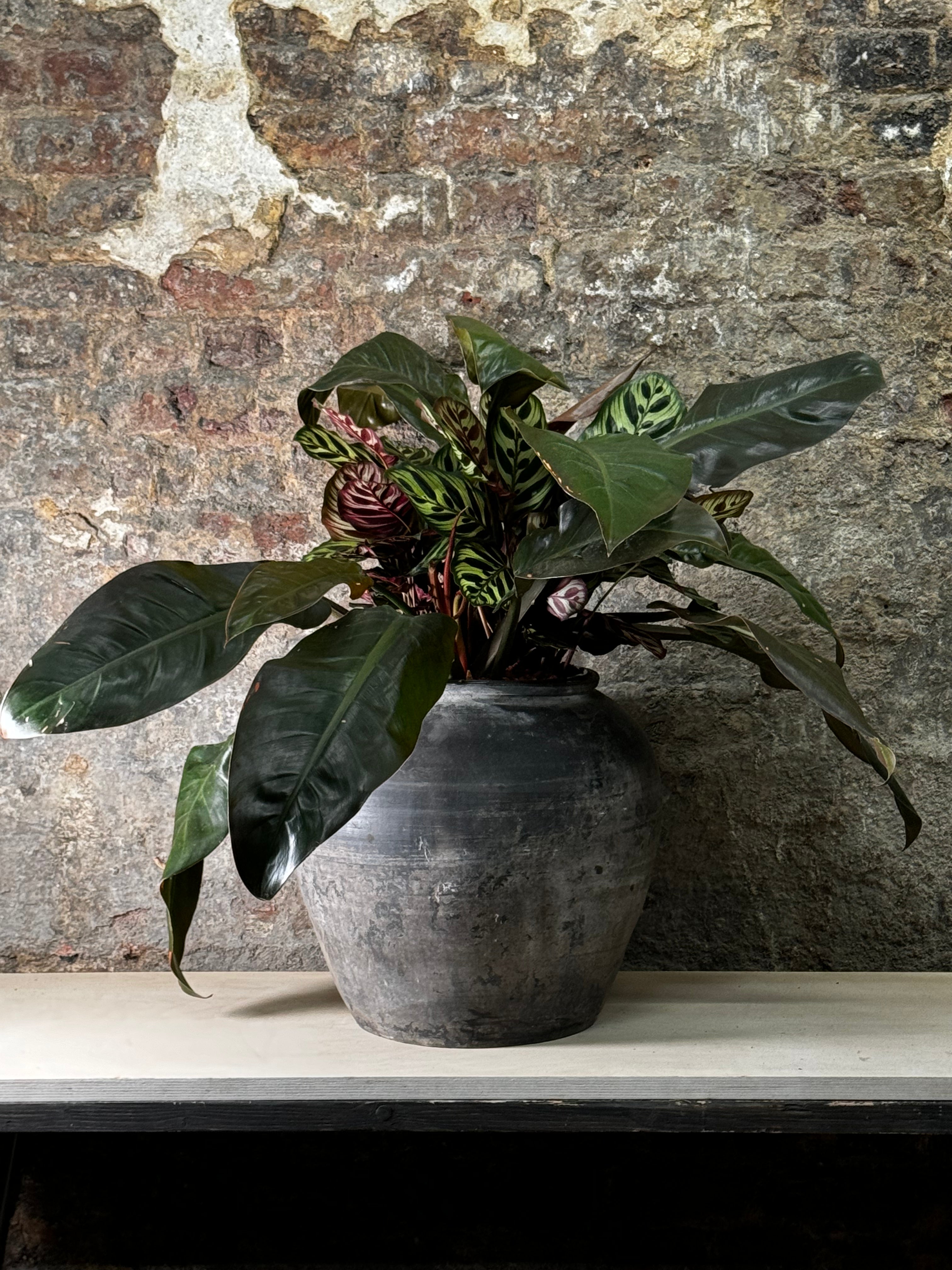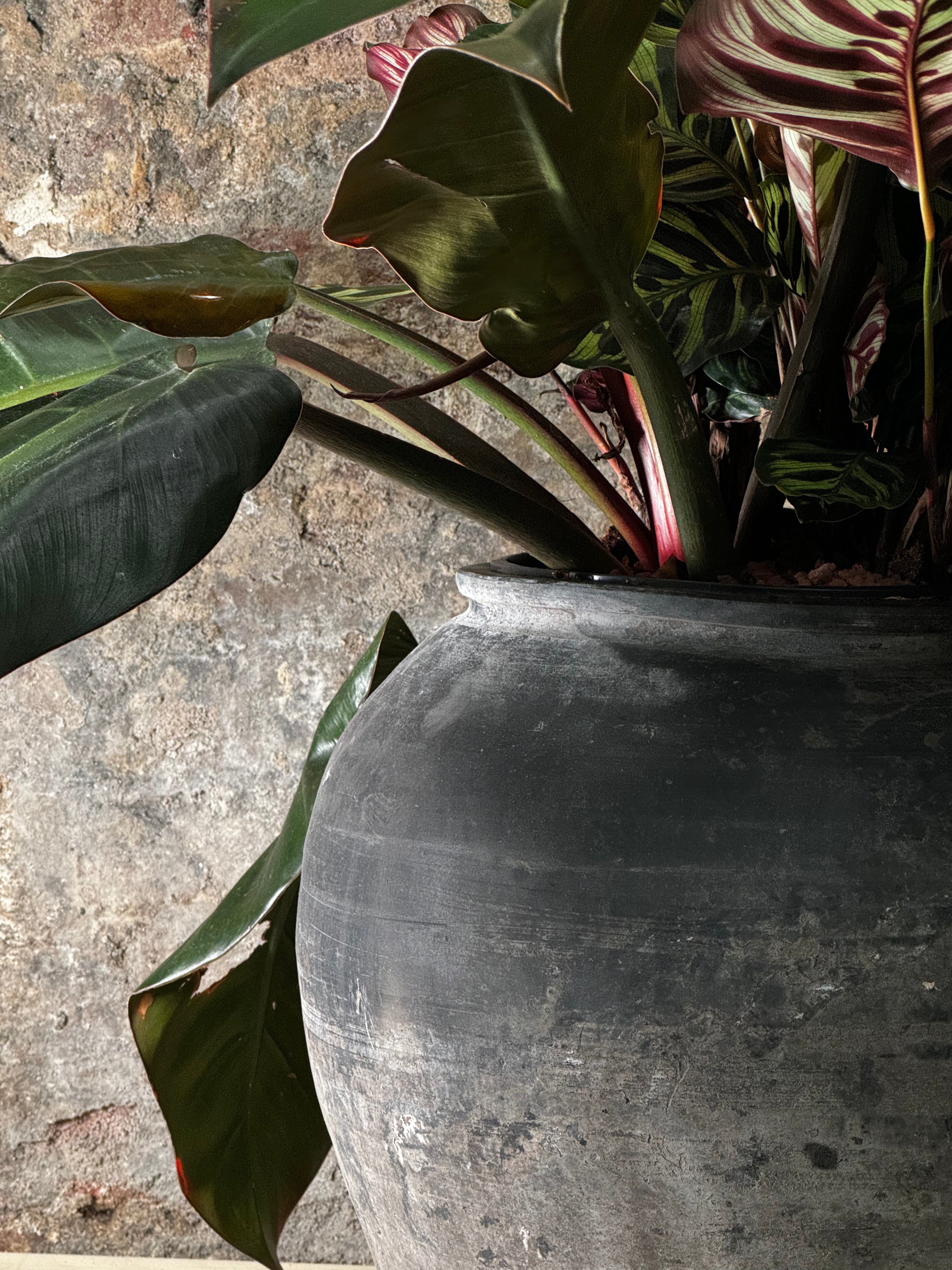 Vintage dark grey earthenware pot with signs of aging. These pots are hand made and are very decorative. They have a beautiful patina due to age. They are from the Shanxi province and crafted c. 1950's.